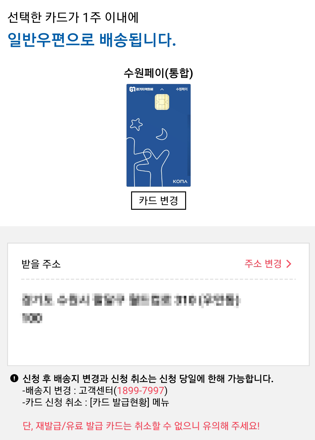 주소를 확인하고 완료하면 카드가 배송됩니다.