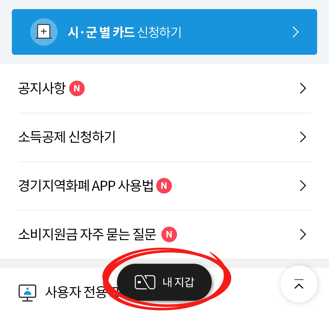 경기지역화폐 앱 홈에서 시군별 카드 신청하기를 누르세요